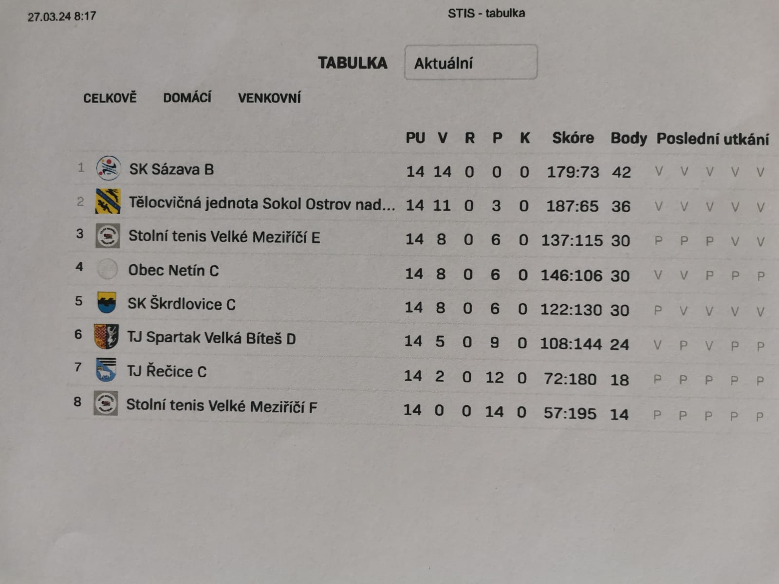 V letošní sezóně 2023-2024, která nyní skončila se náš B-tým v OP4. třídy umístil na skvělém 3. místě a oproti minulé sezóně vylepšil podstatně lepšími výkony umístění o 3 místa! Moc gratulujeme! Je možné, že tým bude moci postoupit z 3. místa do vyšší soutěže, ale záleží na výsledcích všech soutěží. Budeme doufat...